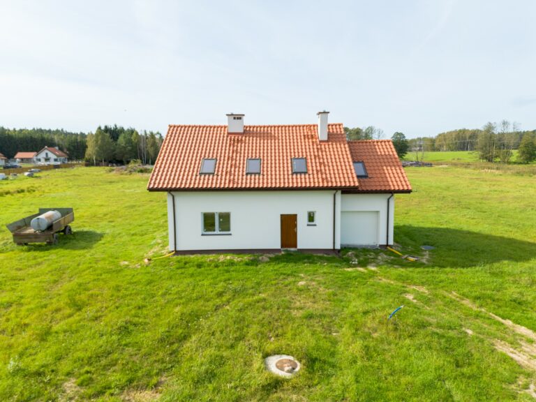 Dom położony jest na dużej działce 1500,00 – 3 000,00 m²,. Istnieje możliwość wykonania ogrodzenia z trzech stron siatką – słupki betonowe, a od ulicy wewnętrznej sztachety na podmurówce oraz brama wjazdowa. Posesja ma kształt zbliżony do równoległoboku zorientowanego krótszą podstawą wzdłuż drogi wewnętrznej. Podjazd do garażu utwardzony.