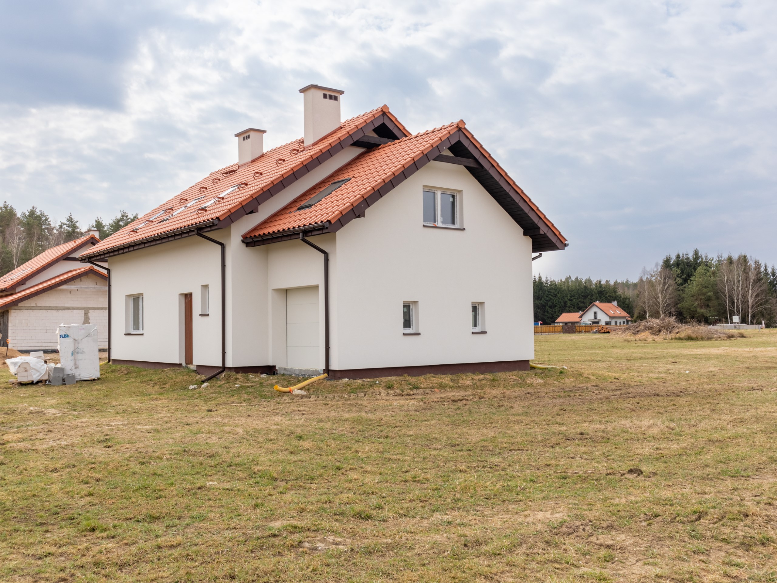 Budynek niepodpiwniczony z dachem dwuspadowym.